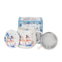 Karácsonyi Porcelán bögre tetővel, fém szűrővel, 430 ml dobozban, Snowman