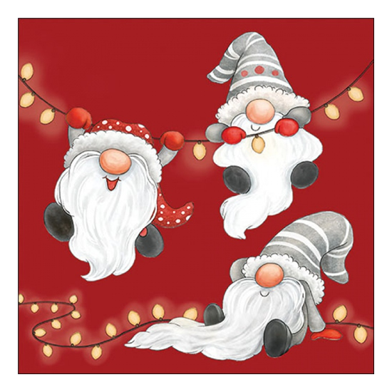 Karácsonyi szalvéta Gnomes on the light chain red 33x33 cm 20 db-os – háromrétegű, minőségi holland papírszalvéta, amely elegáns kiegészítője lehet az ünnepi asztalnak. Ideális választás karácsonyra, szalvéta karácsonyi terítékhez és ünnepi dekorációhoz.