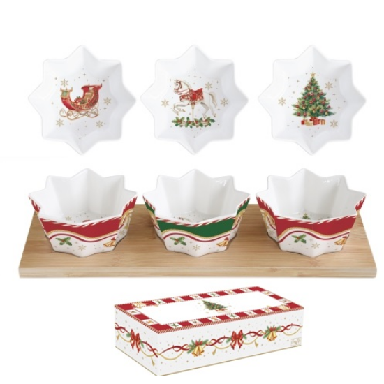 Karácsonyi porcelán csillag tálka szett 3 db-os bambusztálcán 34x12 cm díszdobozban Christmas Tale